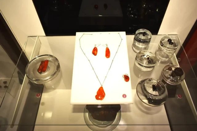 Alongside amber, the museum displays mineral specimens and “mineral flowers” from different regions of Romania, positioning the institution as an important reference point for national geological heritage. The amber itself varies widely in color, ranging from golden yellow to reddish-brown and even greenish-black tones, presented both in raw and polished forms.