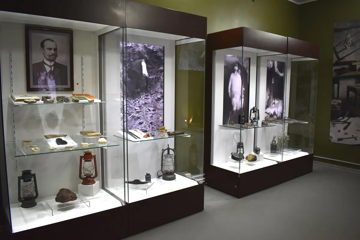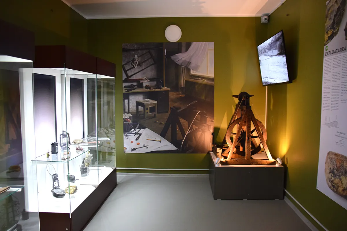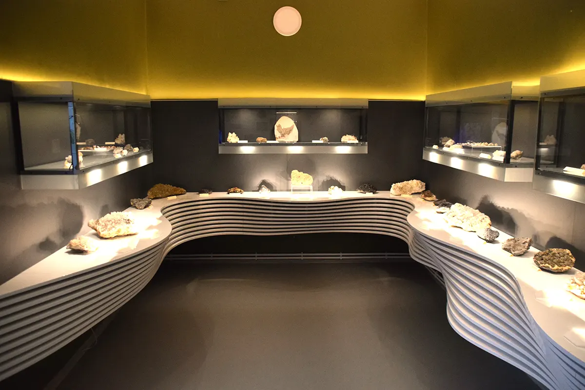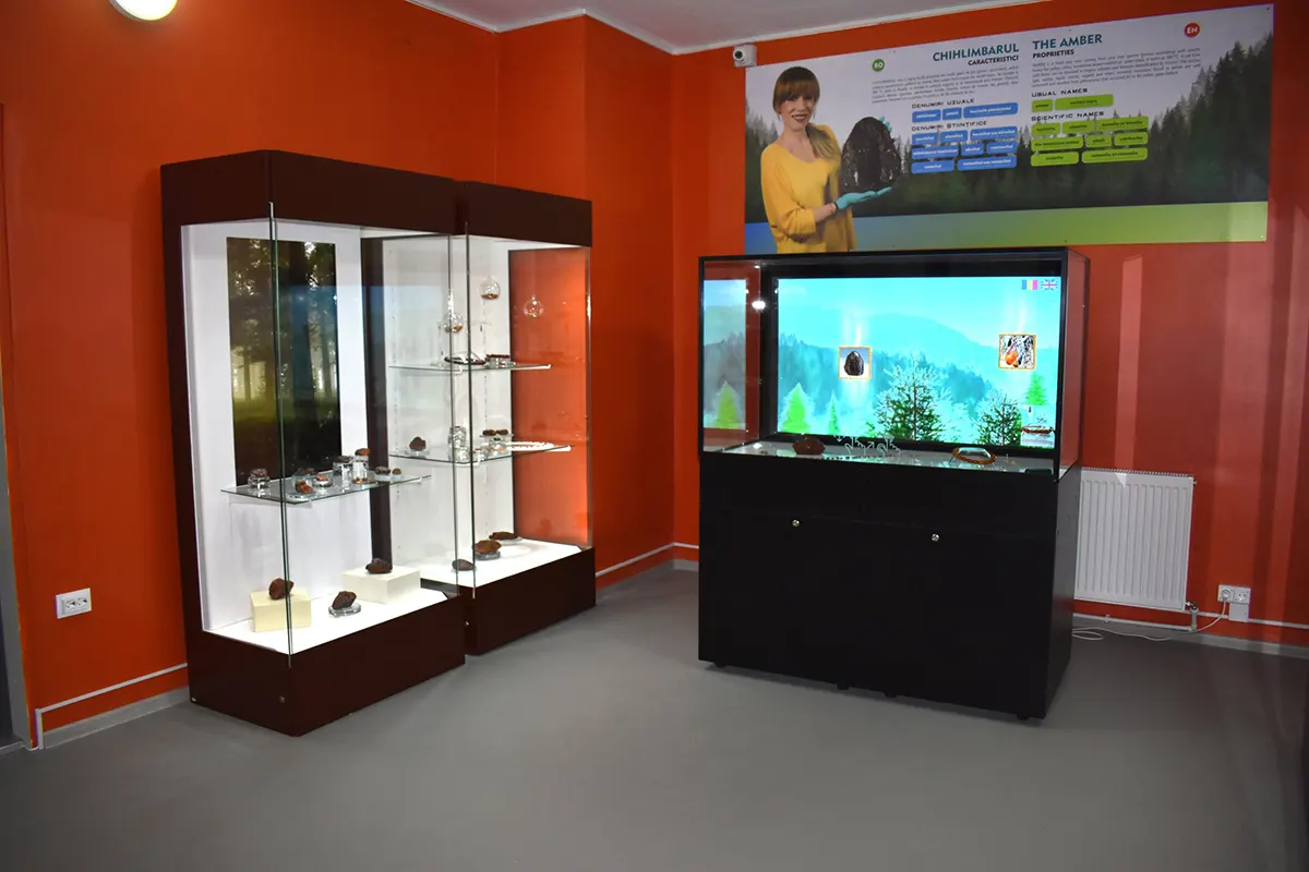 Another gallery explores the history and refinement of amber as a material, while a separate space is dedicated to minerals and geological samples from across Romania, presented in a modern museographic setting.